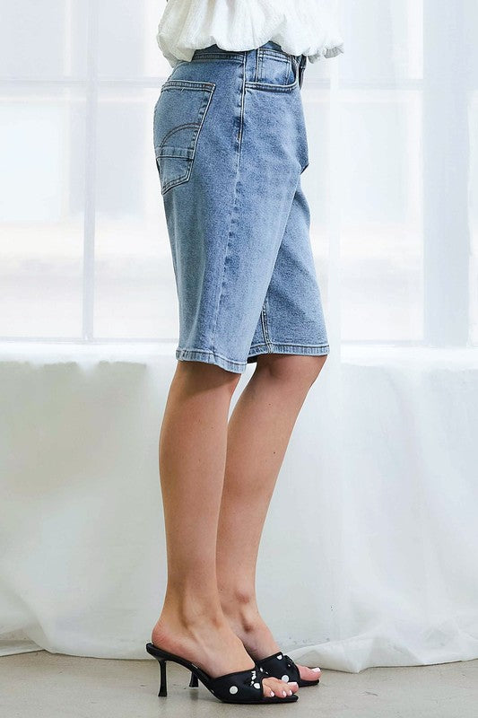 A pair of jorts featuring adjustable waist with straps, classic 5-pocket construction and a zip-fly closure.