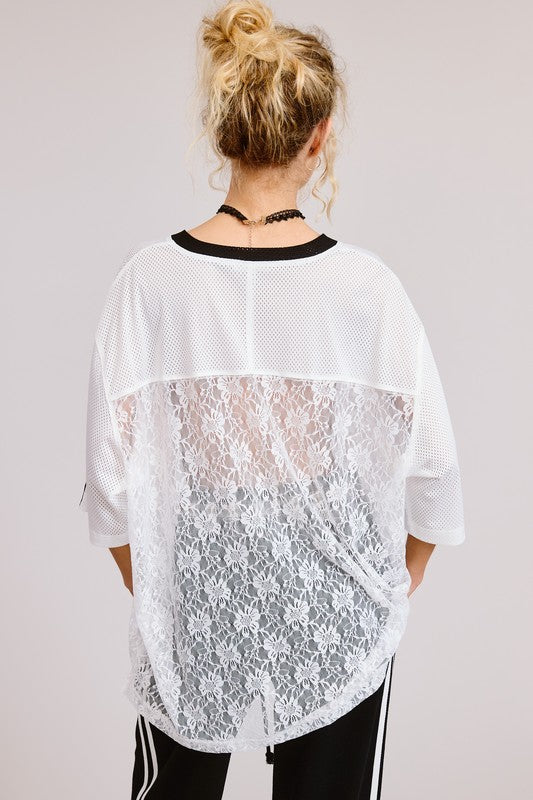This sporty chic oversized short-sleeve jersey shirt top is a perfect blend of athletic and feminine style. Designed with breathable jersey mesh fabric, it features a contrast floral sheer lace bodice, side slits, and a bold "85" graphic printed lettering on the front. The V-neckline and dropped shoulders are accented with contrast stripes, and the oversized fit adds a relaxed, stylish touch. Pair it with shorts and sneakers for a perfect look on weekend game days!